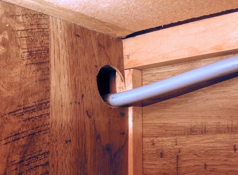The mouse had obviously ducked in there and descended to floor level, but I could still hear it. Fortunately, below the bottom drawer is the water pump, and years ago I had made a 10" x 10" access door for it—otherwise you'd have to stick your hand in through an extremely small drawer opening to get to it. So I moved Marie's dishes out of the way and flung open the door...
