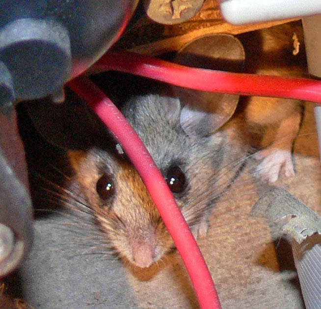 ...and there was the mouse, crouching in the big hole in the floor that the water pipes run into! Cute little guy, isn't it? It was now obvious how it had gotten access to the cabinets.