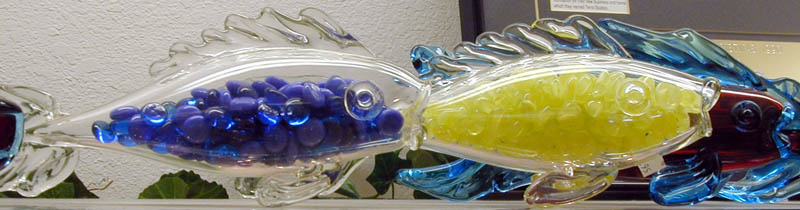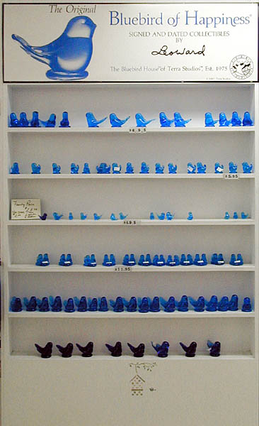 There were also handblown glass ornaments in a variety of styles; some lovely and unusual paperweights; delicate glass filigree work; a series of handsome glass fish; and a row of spectacular glass flowers. I admired the ornaments and vases, but all I bought were a few Bluebirds in various sizes as gifts for my friends.