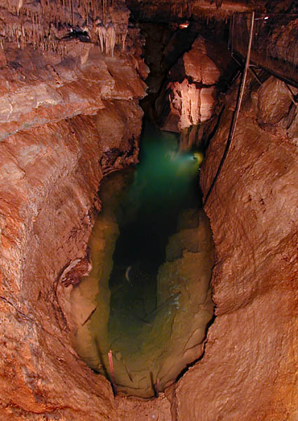A young fellow named Scott took me underground for a 45-minute tour of the cave. It's quite impressive! Like most limestone caverns, it's actually a string of caves hollowed out by erosion. There's an underground "lake" near the entrance—actually more of a pond in surface area, but reportedly it's more than 70 feet deep. Pale, semi-blind catfish and salamanders live down there, where it's always moist and the temperature is 61° F. all year round.