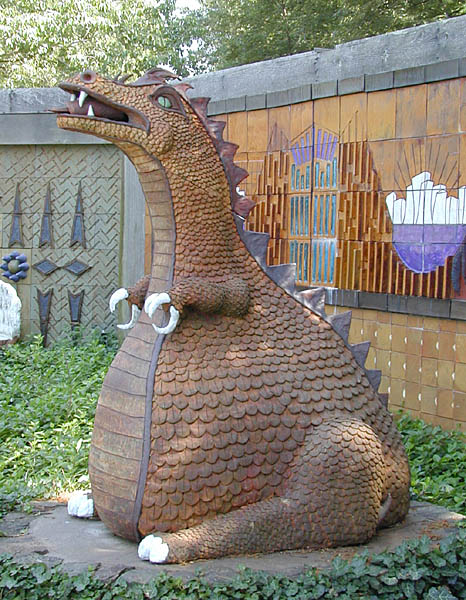 There are human figures, animals, plants, dragons, gnomes, trolls and figments of some wild imaginations. Far from the smooth, minimalist lines of the Bluebirds, these creations are complex, richly textured...as well as quirky and in some cases just plain funny. In fact, this whole place looks very much like something my old ceramicist friends from college, Jimmy and Tojie Colavita, would have come up with, given the time and the money. (Jimmy went on to become a regionally well-known sculptor and teacher, before dying unexpectedly a couple of years ago.)