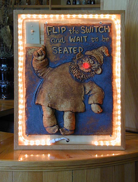 In front of you is the counter, but nobody is there. Do you wait for the hostess to come? No, on the counter there's a ceramic plaque with a droll, off-balance gnome and the words "Flip the switch and wait to be seated." You do, and his nose lights up a brilliant red. Almost immediately the hostess appears and seats you at an oaken table with hand carved inserts along its sides. From one side of each table sprouts a cluster of lamps, looking like exotic flowers, made of hand-shaped brass. A small red light bulb surmounts the arrangement, and switches at the base let you turn on the red light to attract a waiter's attention, or dim the flower-lamps to your taste.