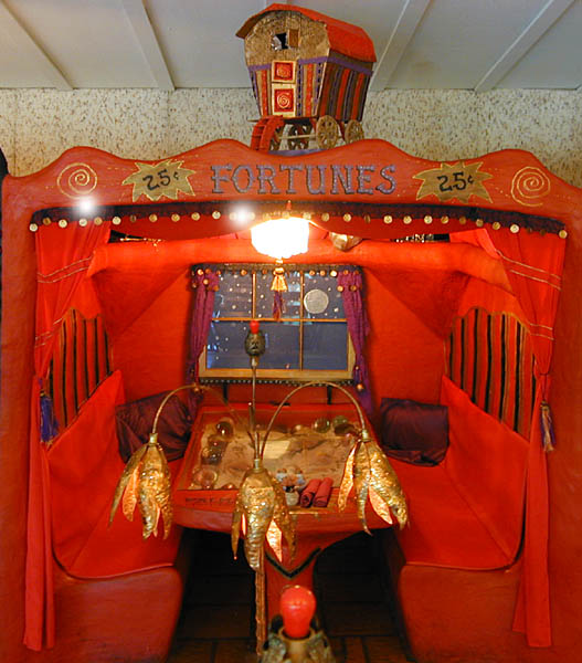 Off to one side are five "theme booths"—each different, each wildly imaginative. One is a troll family's cozy den; one is the interior of a gypsy fortune-teller's caravan; one is tiled with mystical cobalt-blue glass rondels and oriental inscriptions...I have never seen anything remotely like this.