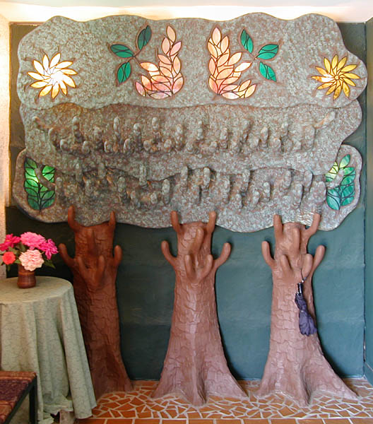 Inside, you find yourself in the foyer facing a trio of stylized trees, with funny, stubby branches that you can hang your umbrella or hat on. Inserts of stained glass are illuminated from behind, giving the whole room a cheerful glow. The hatrack trees grow out of a floor of hand-set mosaic tiles in irregular shapes.