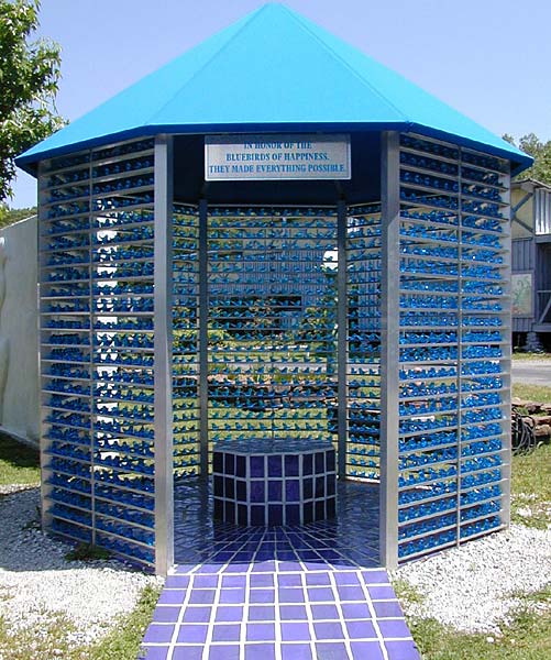 I ought to pause here and summarize the history of the place. Terra was founded in 1975 by two California schoolteachers, Leo and Rita Ward, who quit their jobs, bought a few acres in the Ozarks and started a crafts business there. Leo is a glassblower and Rita a ceramicist. About five years later Leo came up with the "Bluebird of Happiness," which quickly became a hot seller in gift shops nationwide. Building on the profits from the sale of Bluebirds, the Wards attracted other glass and ceramics artists, expanded their scope to include arts and crafts classes of all kinds, and gradually assembled a 110-acre campus of buildings—each one decorated with unique handmade artifacts. In fact, there's even a small "Bluebird Pavilion" whose walls are made of 1,800 Bluebirds. A sign above the entrance reads "In honor of the Bluebirds of Happiness. They made everything possible."