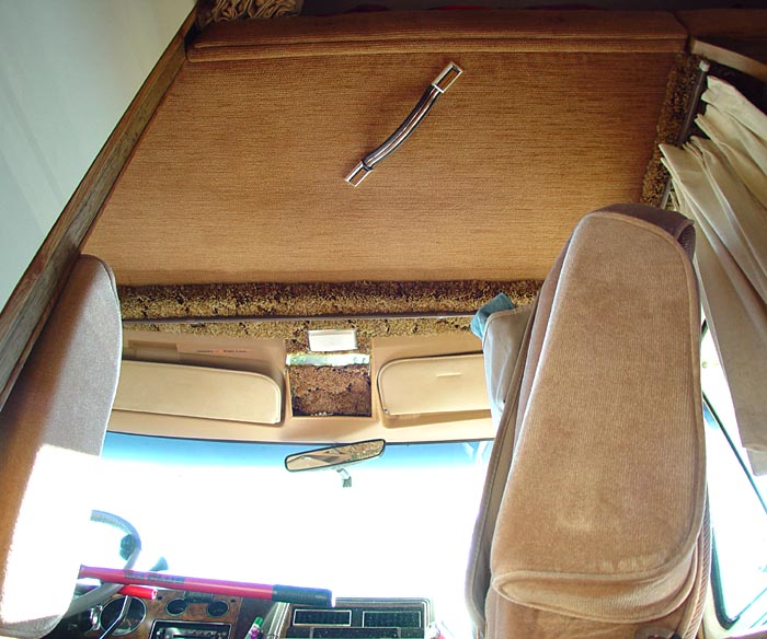 One of the many small but thoughtful touches Lazy Daze built into Gertie was an "assist handle" above the edge of the overcab bed. This makes it easy to get out of bed and come down the ladder forward, instead of having to do it backward and fumble awkwardly for the rungs with your feet. I liked it so much that I added a second assist handle inside the cab itself. Mounted in the center of the cab's ceiling, this handle gives me something to grab onto when I hoist myself out of the driver's seat to go back in the coach. I got the second assist handle directly from Lazy Daze—I just called them up and asked whether they had it as a separate item, found out what it cost (under ten bucks) and then mailed them a check. (They don't take credit cards.)