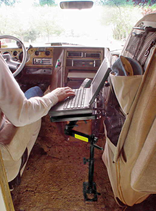 From that location, the front Jotto Desk puts my Mac PowerBook computer right at my elbow. Connected to my Garmin GPS receiver, the PowerBook runs DeLorme's Street Atlas USA software and constantly plots my exact position as I drive. Since I have the world's worst sense of direction, this is a dream come true! The PowerBook is an old one that I had stopped using when I replaced it with a newer, much more powerful model...but it's more than adequate for this purpose, and indeed this is all it does now: it's a dedicated "navicomputer."