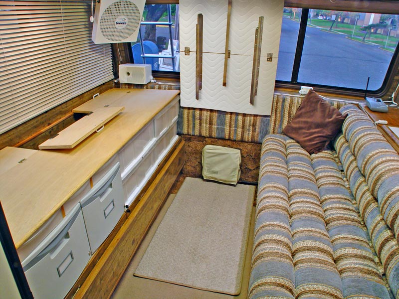 Living full-time in a 22' rig is a challenge when it comes to finding places to put things! One way I dealt with this was to trade seating for storage and work space: I replaced one of my two couches with a "sideboard" consisting of nine drawers, a storage bin, and a plywood work surface. You can read all about this project, which added 15 cubic feet of storage and 12 square feet of work area to Gertie, on the Sideboard page.