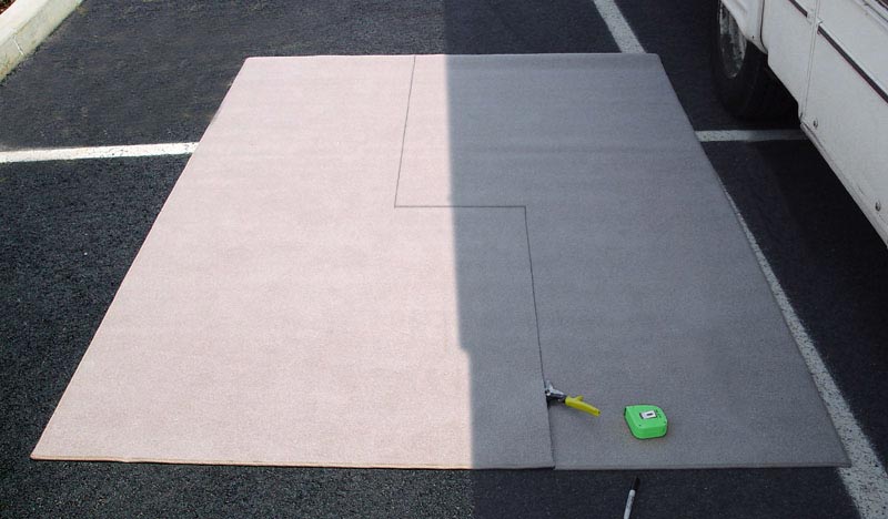 Total cost for my quick-and-dirty recarpeting job: just over $40 in materials and four hours' labor. I actually enjoyed sitting out there in the parking lot, working at my own pace with Paul Desmond playing on the stereo. And the result looks great and feels good underfoot. (Why shouldn't it, with two layers of cushioning underneath it—the original padding and the Lazy Daze carpet?) Here's how the old and new carpet compare—you can see how much lighter the new carpet is! It makes the whole interior feel that much lighter. (See the panorama above for comparison!)