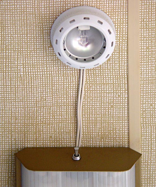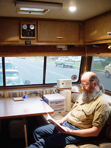Having placed the rear computer work area just where I wanted it, I decided to add a light that would shine right in my lap when I was typing (or reading). I found a pair of 20W low-profile GE halogen lamps at Wal-Mart for $20. These tiny 2.5"-diameter, 1" high lamps came with a 12VAC transformer, so I knew I could discard the transformer and run them on Gertie's 12VDC. I mounted one lamp on the ceiling right above the couch and wired it to the 12V supply available at the existing fluorescent fixture, adding a toggle switch to one end of the fixture to control the new lamp. It works very well, projecting a bright beam of light right where it's needed. And the 20W power consumption is actually less than the fluorescent fixture! Here's what it looks like in use.