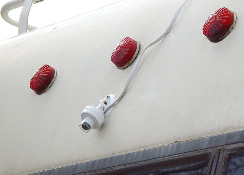 The flat white 15' cable attached to the X-10 camera was just long enough to reach to the wardrobe; I used Belden 8218 75Ω coaxial cable to extend the video cable along the upper curbside wall and into the overcab area, securing it with small 3M Command Adhesive removable "Decorating Clips." (I've used these clips a lot in Gertie; they really come in handy for keeping runs of small wires neat—and they can be repositioned at will.)