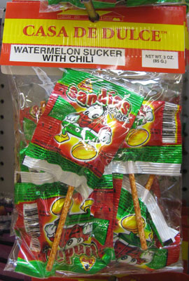 Of course, I often find regional specialties that I wasn't looking for, such as this 165-year-old "volcanic oil" patent medicine (not actually volcanic; it's made from turpentine) that's apparently still a popular cure-all in some parts of the country... or the watermelon-and-chili lollipops... or the gummi eyeballs. There's almost always something new and surprising, like the lard section in the Gallup, NM Lowe's supermarket. I had never seen so much lard in my life, including big eight-pound buckets of the stuff.