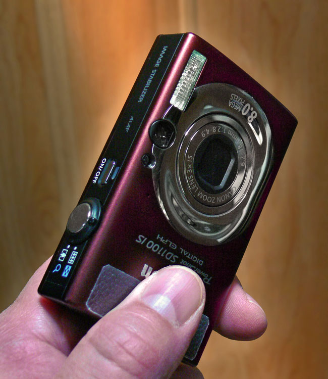 You see, long ago I was a freelance photographer with a bulky case full of SLR camera bodies, lenses (everything from 7.5mm to 400mm) and accessories... and I had the sore arms to prove it. But I sold my SLR outfit years ago, and made a deliberate decision to go "light and agile." Everything I carry now fits in that Walmart fanny pack. In fact, that's my deciding criterion when choosing a camera: if it won't fit in the fanny pack, I won't buy it. Wearing the pack on my waist leaves both my hands free, and I almost never carry a tripod.